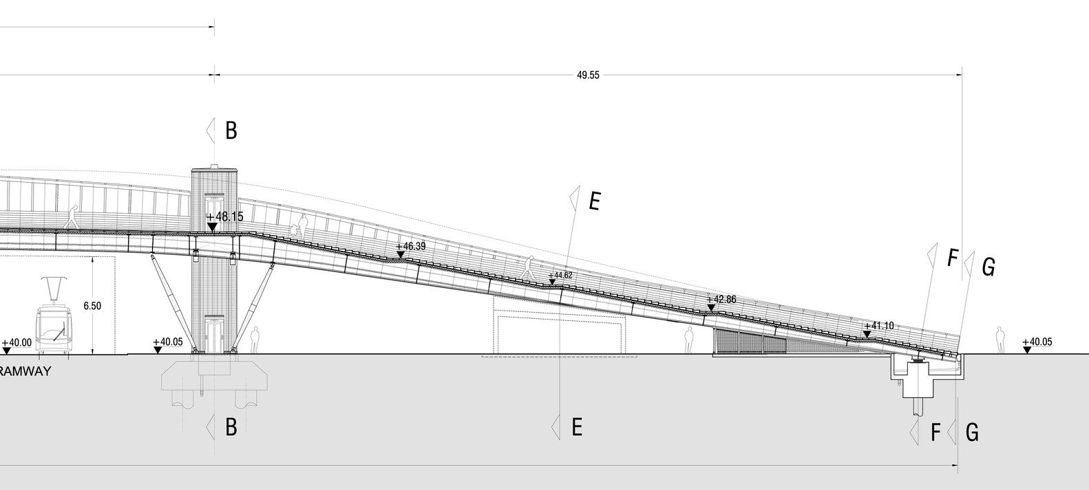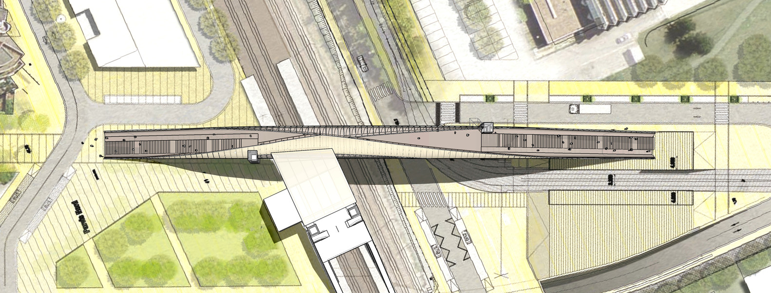因此,人行橋有兩重角色:直達車站的通路和鄰里街區的樞紐。它不僅是道路立體樞紐,同時還作作為南北之間的城市連結體改善交通流。